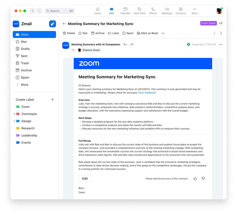 줌 AI 컴패니언 사용자는 추가로 지원되는 어어로 미팅 중 문의를 남길 수 있으며, 회의 요약 전문 앞에 개요를 받아볼 수 있다.
