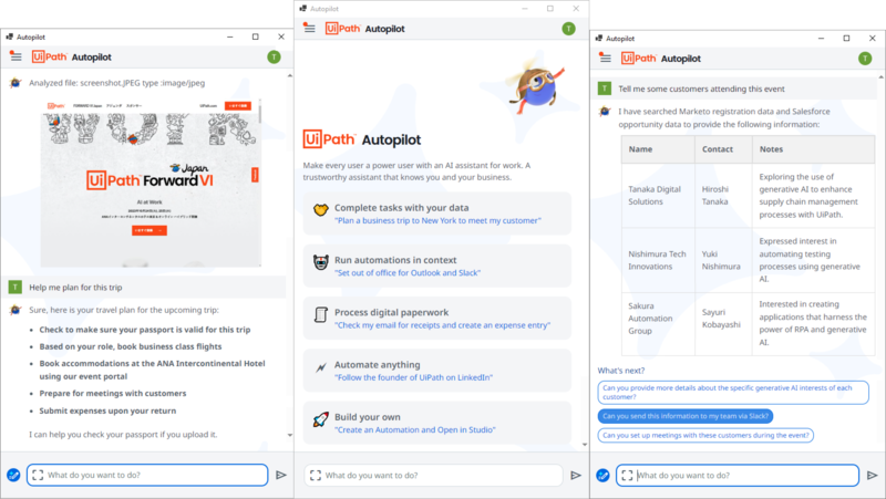 또한 일반 사용자는 오토파일럿 포 유아이패스 어시스턴트(Autopilot for UiPath Assistant)와 AI 동료처럼 서로 협업해 업무를 처리할 뿐 아니라, 애플리케이션 간의 복잡한 데이터 복사나 붙여넣기 작업을 통해 업무 소요 시간을 감축하는 클립보드 AI 기능을 제공한다. 비즈니스 사용자는 API나 UI 자동화를 기반으로 비즈니스 프로세스를 업데이트하고 담당자의 감독하에 더 많은 작업을 자동화할 수 있다.