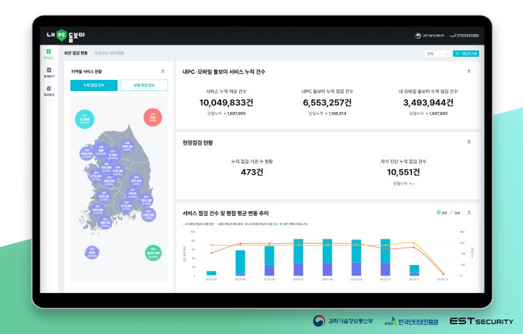 이스트시큐리티와 잉카인터넷 컨소시엄은 과학기술정보통신부(이하 과기정통부)와 한국인터넷진흥원(이하 KISA)이 진행하는 '2023년도 내PC·모바일 돌보미 서비스 운영’ 사업자로 선정돼 지난 4월부터 전국민을 대상으로 무료백신 알약(PC)과 알약M(모바일)을 통해 제공한 보안 점검 서비스 누적 건수가 1000만건을 돌파했다고 밝혔다.