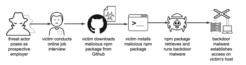 이 공격은 위협행위자가 타깃이 되는 피해자를 화상 인터뷰에 참여하도록 초대하며 시작된다. 인터뷰 중 위협 행위자는 피해자에게 깃허브(GitHub)에서 호스팅되는 NPM 기반 패키지를 다운로드해 설치하도록 유도한다. 위협 행위자는 피해자에게 이 패키지를 검토 또는 분석할 소프트웨어로 제시하지만, 실제로는 피해자의 호스트를 백도어 멀웨어로 감염시키도록 설계된 악성 자바스크립트가 포함돼 있는 방식이다.