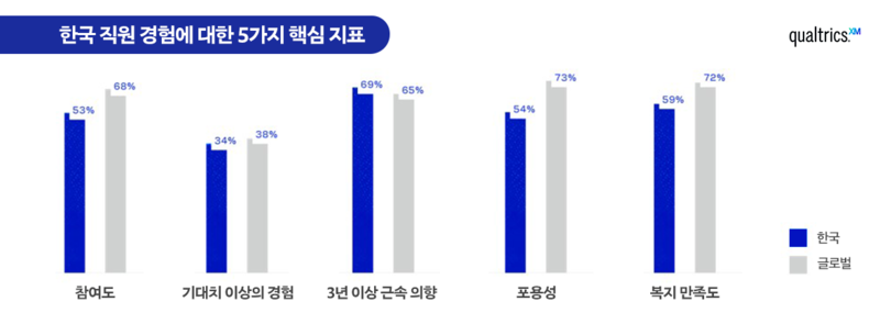 보고서에 따르면 한국은 긍정적인 직원 경험을 나타내는 5개 핵심 경험 지표 중 참여도, 기대치 이상의 경험, 포용성, 복지 만족도와 같은 4가지 항목에서 글로벌 평균보다 낮게 나타났다. 반면 근속 의향 지표는 한국이 69%로 글로벌 평균보다 4% 포인트 높게 나왔다.