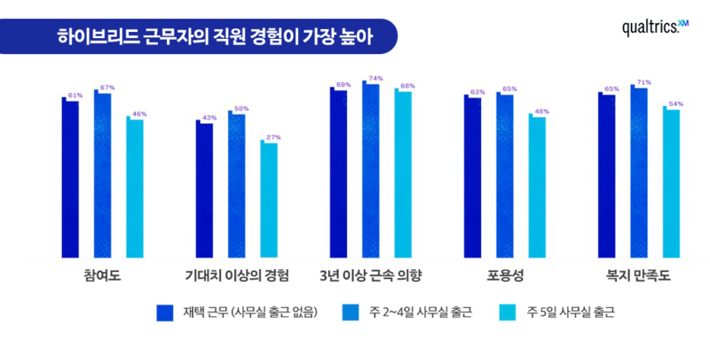 국내에서 직원의 사무실 출근 일수에 대한 논의가 이어지는 가운데, 퀄트릭스 조사에 따르면 재택 근무와 사무실 근무가 혼합된 하이브리드 근무 형태의 직원이 타직원보다 5개 핵심 경험 지표 중 참여도, 경험, 근속 의향, 포용성, 복지 만족도가 가장 높게 나타났다. 응답자들은 주 5일 사무실 출근이 아닌 이상, 사무실에 출근하는 날이 있는 것이 아예 없는 것보다 낫다고 답했다.