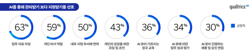 한국 직원 중 직장 내 AI 사용에 열려 있다고 답한 비율은 46%로, 글로벌 수치인 42%보다 상대적으로 높게 나타났다. 응답자들은 직장 내 AI 사용과 관련해 업무 성과 평가(34%), 채용 면접(30%), 교육(36%) 등 중요도가 높은 업무보다는, 업무 자료 작성(63%), 개인 비서 역할(59%), 내부 지원 부서에 연락(50%) 등과 같이 AI를 제어하고 지시할 수 있는 상태에서 AI의 지원을 받는 것이 더 편하다고 답했다.