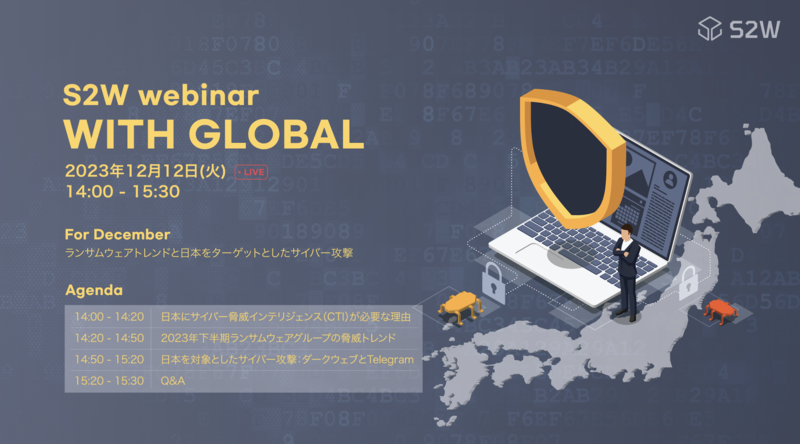 데이터 인텔리전스 기업 S2W(에스투더블유)은 12일 일본 주요 기업과 기관 대상으로 ‘WITH GLOBAL’ 웨비나를 개최, 최근 일본에서 증가하는 랜섬웨어, 다크웹 피해 사례 관련 트렌드를 공유하고 개별 기업의 보안 대비책 마련을 강조했다.