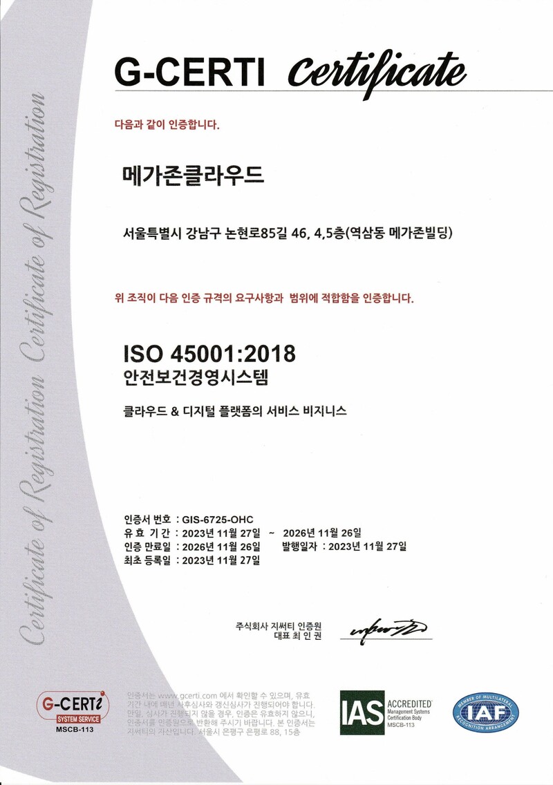 ISO 45001은 안전보건 관리에 대한 국제표준 인증으로, 사업장에서 발생할 수 있는 위험 예방과 안전한 근무환경을 위한 체계적 시스템을 갖춘 기업에 부여된다. 메가존클라우드는 국제표준화기구의 인증기관인 지써티 인증원으로부터 인증을 획득했다.