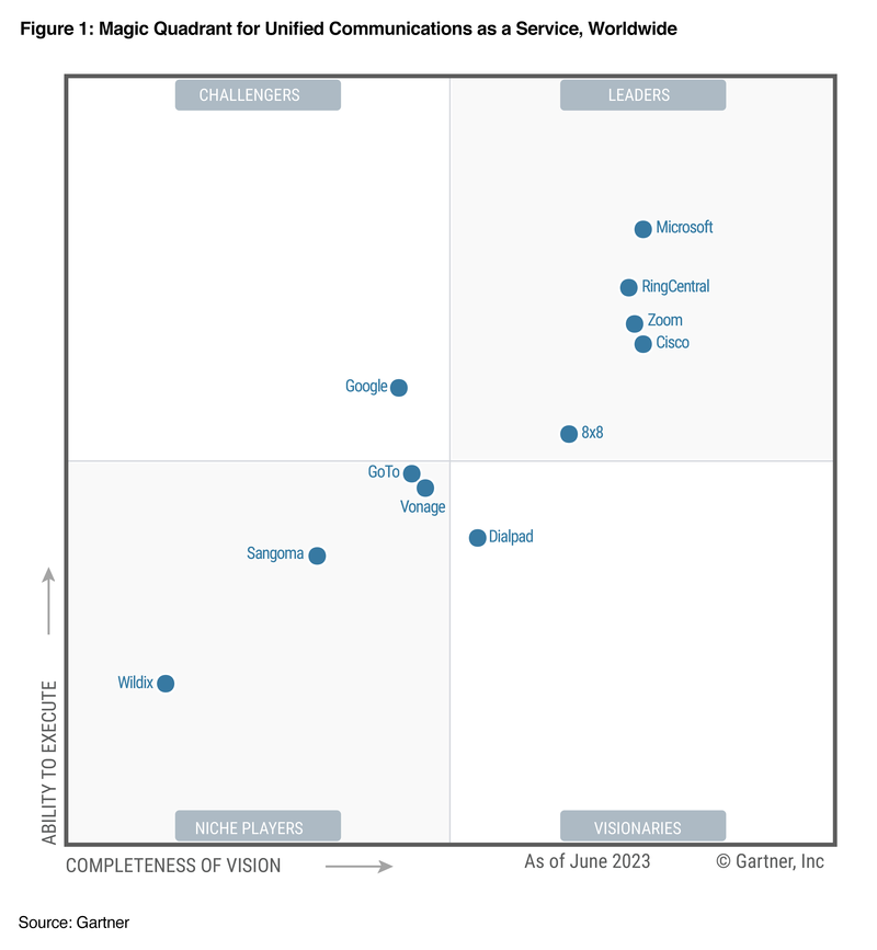 가트너는 매직 쿼드런트 UCaaS 부문에서 기업 총 11곳을 분석해 줌을 리더로 선정했다. 줌은 줌 팀챗(Zoom Team Chat), 줌 폰(Zoom Phone), 줌 미팅(Zoom Meetings), 줌 컨택센터(Zoom Contact Centeer), 줌 AI 컴패니언(Zoom AI Companion) 등 엔터프라이즈 솔루션을 공급하고 있다.
