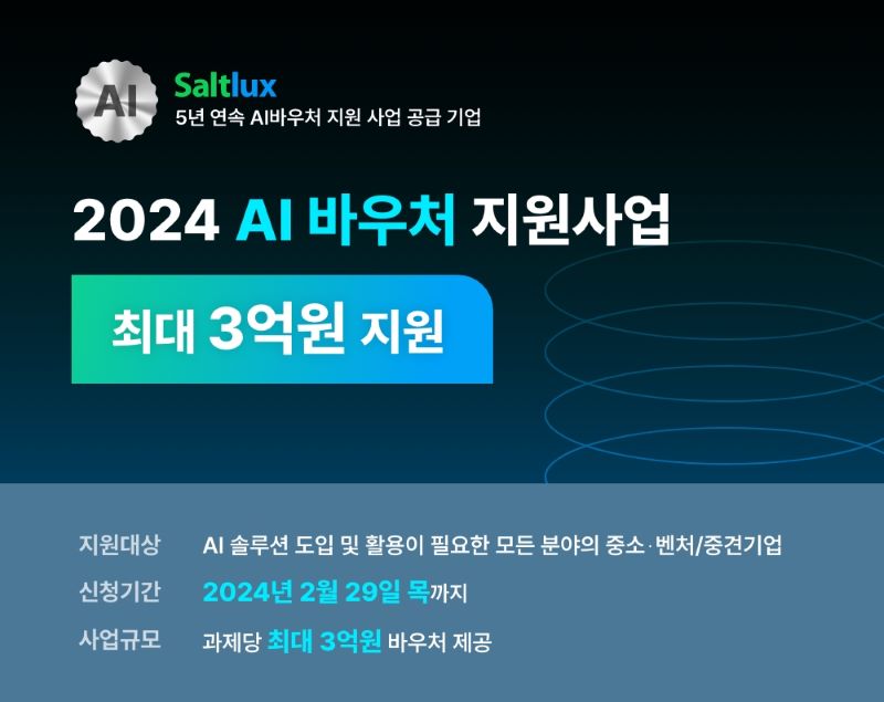 인공지능 기업 솔트룩스(대표 이경일) 및 자회사 다이퀘스트와 플루닛은 과학기술정보통신부 및 정보통신산업진흥원이 추진하는 '2024년 AI 바우처 지원사업'의 공급기업으로서 해당 사업에 참여할 수요기업을 모집한다고 밝혔다.
