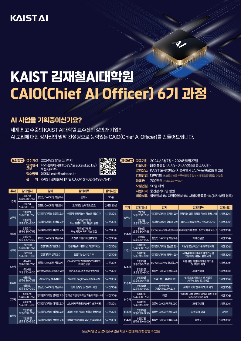 이에 KAIST 김재철 AI 대학원에서 CAIO 과정을 신설하고 6기 과정을 모집한다고 밝혔다. 이 과정은 기업이 AI를 통해 비즈니스 연속성과 새로운 기회를 마련할 역량을 갖춘 CAIO 양성을 목표로 한다.