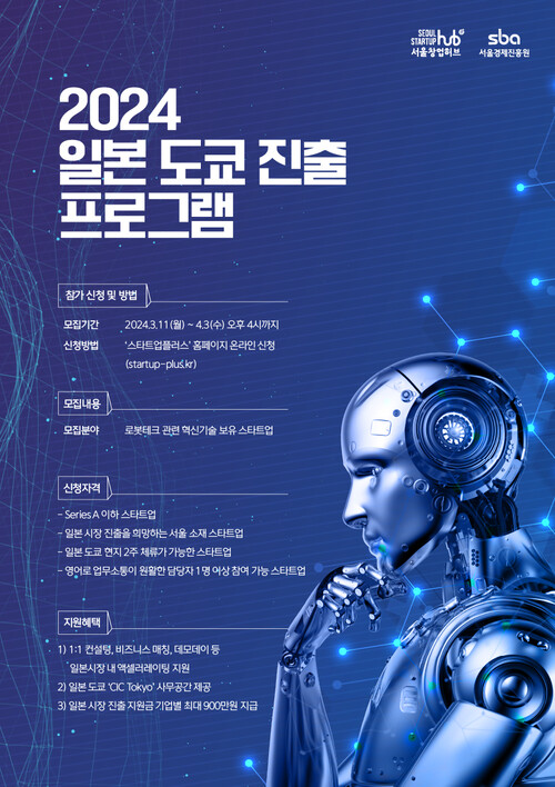 서울시 중소기업 지원기관 서울경제진흥원(舊 서울산업진흥원, 대표이사 김현우, 이하 'SBA')은 로봇테크 관련 혁신기술을 보유한 서울 스타트업의 일본 시장 진출을 지원하기 위해 일본 현지 혁신 커뮤니티인 CIC(Cambridge Innovation Center Institute Tokyo, 이하 'CIC Tokyo')와 협력해 ‘2024 일본 도쿄 진출 프로그램’을 진행한다.