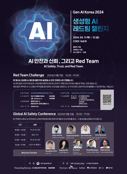 행사 1일차에 개최되는 ‘레드팀 챌린지’는 네이버클라우드‧SKT‧업스테이지‧포티투마루 등 국내를 대표하는 AI 기업의 모델을 대상으로 1000명의 참가자가 잠재적 위험‧취약점을 식별하는 공개 챌린지 방식으로 진행된다.