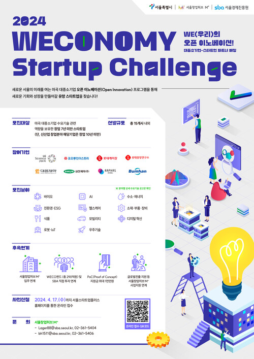 중소기업 지원기관 서울경제진흥원(대표 김현우, 이하 ‘SBA’)은 오는 4월 17일(수)까지 ‘2024 Weconomy Startup Challenge(위코노미 스타트업 챌린지)’를 통해, 마곡 대·중견기업 8개사와 함께 서울의 미래를 여는 유망 스타트업을 공동 모집한다.