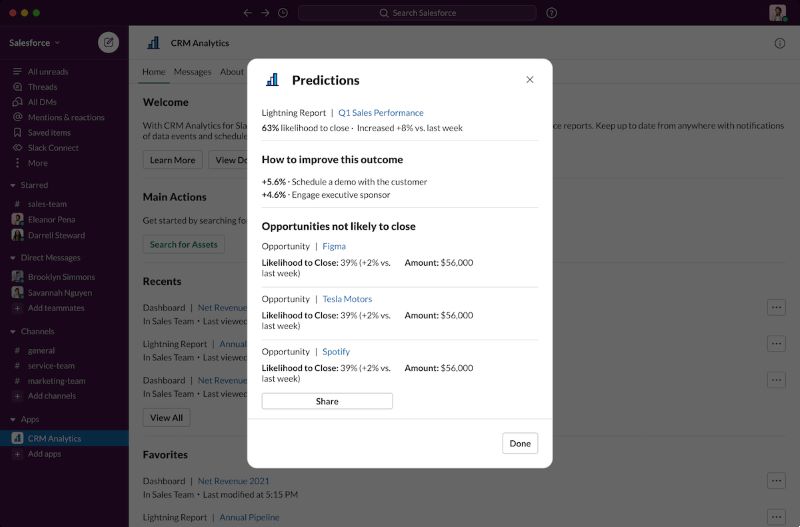개발자는 에이펙스(APEX) 코드를 통해 미들웨어 없이 슬랙에서 활용 가능한 앱을 개발할 수 있다. 슬랙에 세일즈포스 데이터와 메타데이터를 통합하여, 세일즈포스 레코드를 불러오거나 시각화할 수 있다. 전사 부서는 슬랙을 기반으로 신속하게 협업하고, 업무를 자동화하고, 실시간 데이터 인사이트를 기반으로 의사결정을 내릴 수 있다. 세일즈포스는 슬랙에서 바로 데이터를 분석하고 협업할 수 있는 ‘슬랙을 위한 CRM 애널리틱스 앱’도 공개한 바 있다.